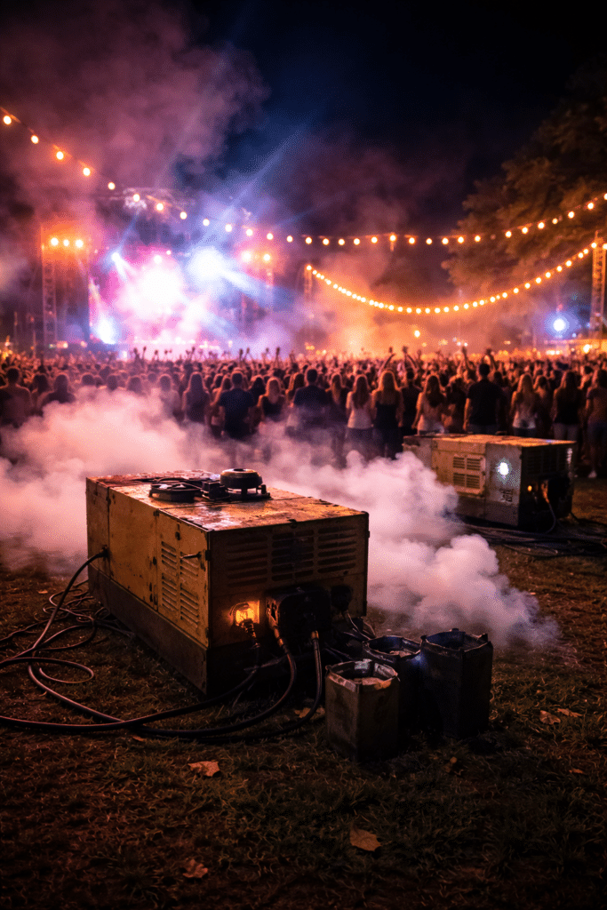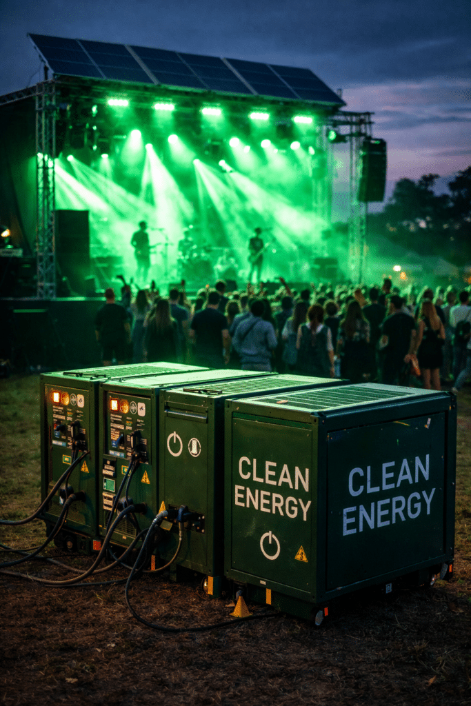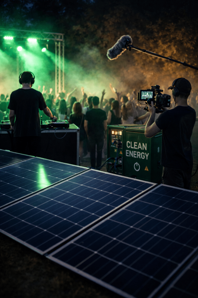 Traditionnellement, les festivals et tournages sont très polluants, reposant sur des groupes électrogènes alimentés au diesel. Un rapport du Julie’s Bicycle estime qu’un grand festival peut émettre plus de 500 tonnes de CO₂, notamment à cause de la production d’énergie temporaire.