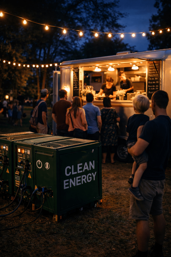 Financé par le conseil municipal, ce hub est une unité de stockage et de distribution d’énergie 100 % renouvelable qui alimente les scènes, équipements lumière et food trucks… sans générateurs à essence ni bruit.